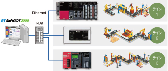 By starting multiple GT SoftGOT2000s or connecting multiple channels, you can easily build a multi-line monitoring system.