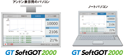 GT SoftGOT2000 is HMI software that runs on a PC or panel computer. Remote monitoring of factory FA devices can be easily performed from a remote computer or panel computer.