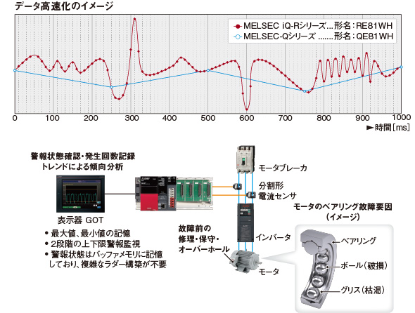 Achieves detailed power measurement for each production facility. One unit can measure electric energy (consumption / regeneration), reactive energy, current * 3 , voltage * 3 , electric power, power factor, frequency, harmonic current, harmonic voltage, etc. By constantly monitoring the current of the motor, etc., line stop and down time can be avoided, delivery time troubles due to production stoppage, maintenance man-hours, and costs are reduced. In addition, by detecting abnormalities in the voltage and current of the manufacturing equipment and lotting out the products produced in the event of abnormalities, we prevent the outflow of defective products to the market.