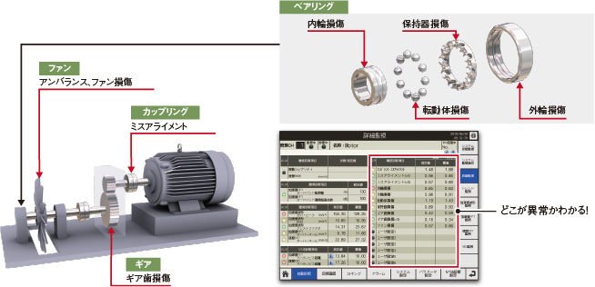 The characteristic frequency is calculated from the specifications of the components of the equipment, and the abnormal location is estimated by monitoring.