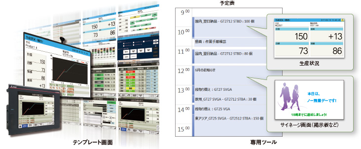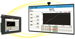 By displaying the information obtained from the production equipment on the ANDON monitor etc. via GOT2000, the information on the site can be shared and visualized.