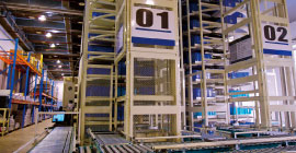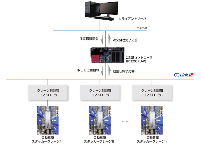 In the conventional system, production information, inventory information, and entry / exit management are managed using a process computer (processor computer), and the information is transmitted to an automatic warehouse controller to control a stacker crane and an entry / exit cart. Was. However, it took time and cost to restore the system due to the failure of the continuous operation of the computer. By replacing this program controller with a C language controller, stable continuous operation is possible. It also significantly reduces maintenance costs.
