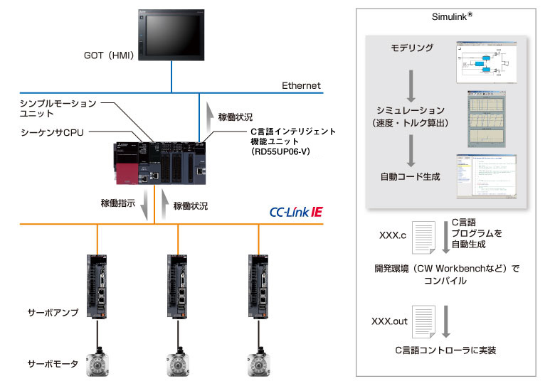 For destination management, it is necessary to calculate the optimal transport route to the destination specified by communication with the host system, obtain the transport control status according to the calculation result, and issue a transport control instruction. To execute this, high-speed communication with transfer control equipment is required in addition to data processing in the highly versatile C and C ++ languages. Can be achieved. In the transfer system, the GOT (HMI) is mounted on the transfer device, and the transfer device can be operated even when communication with the host system is not possible. These units have excellent environmental resistance, so they can be installed together with the GOT (HMI) inside the control panel, saving space. In addition, by developing a model-based environment using MATLAB ® / Simulink ® , the speed and torque required for transfer control can be calculated, realizing high-speed transfer.