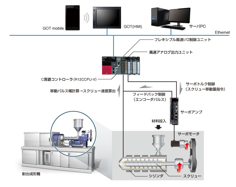 With the introduction of the C language controller, the screw speed is calculated from the pulse width of the screw movement and compared with the specified injection pattern to control the amount of screw movement. First, hardware calculation of pulse width measurement on the order of μs is performed by the flexible high-speed I / O control unit. The C controller calculates the screw movement amount at high speed based on the calculated screw speed and the fed back encoder pulse, as compared with the specified injection pattern. With the introduction of the MELSEC iQ-R series C language controller, higher performance control is realized.
