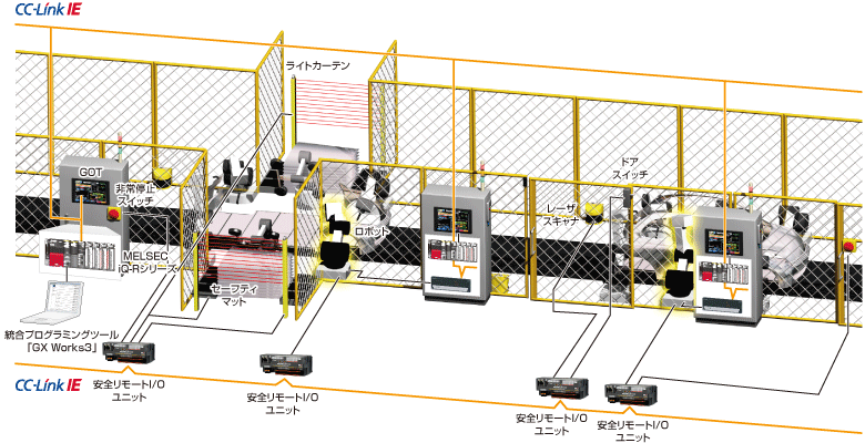 Since the safety sequencer is compatible with CC-Link IE Field Network, the safety remote I / O unit can be connected with a single cable, and safety signal wiring can be reduced.