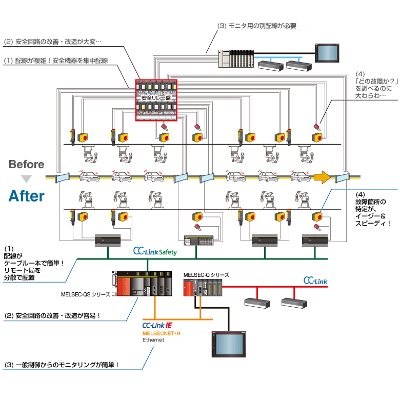 MELSEC-QS series will solve the problems and problems of conventional safety circuit construction, such as complicated wiring and time-consuming troubleshooting.