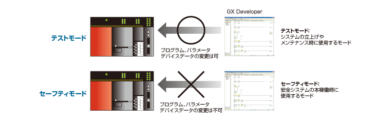 By adopting the safe CPU operation mode, the conventional convenient debugging functions (device test, writing during RUN, etc.) can be used only in the test mode.