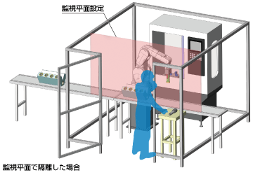 - When the safety fence is opened, the robot continues low-speed operation inside the monitoring plane. Workers can perform inspection work etc. inside the safety fence and outside the monitoring plane