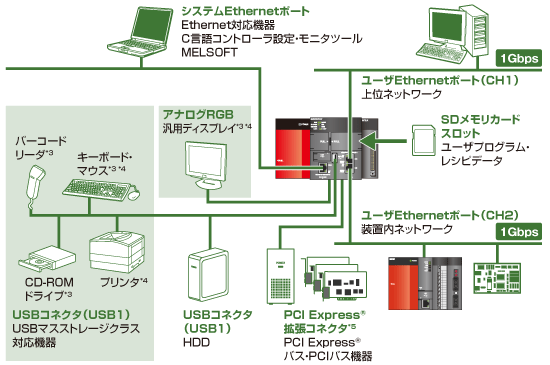 Equipped with 2 channels of Gigabit Ethernet ports used for user programs, a variety of interfaces such as setting and monitoring tools, system Ethernet ports for various MELSOFT connections, SD memory card slots, USB connectors, and PCI Express® expansion connectors. The system can be expanded with higher performance and flexibility, such as higher-speed host communication and support for large-capacity data, and the use of assets of devices with PCI Express ® and PCI buses. In addition, support for Linux ® allows you to utilize a wealth of peripheral devices (drivers) and applications, and expand your system flexibly.