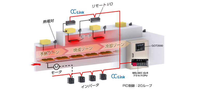 The monitoring operation is built with the display GOT, which has excellent environmental resistance, and has a system configuration that is space-saving, highly functional, and has excellent cost performance.