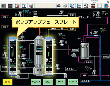 Environmentally resistant GOT at the site and monitoring operation such as PID adjustment at the monitoring PC of the monitoring room by linking PX Developer monitor tool and GT SoftGOT2000 . The instrumentation monitoring screen for GOT is automatically generated by the PX Developer monitor tool, and the same screen is used in GT SoftGOT2000.