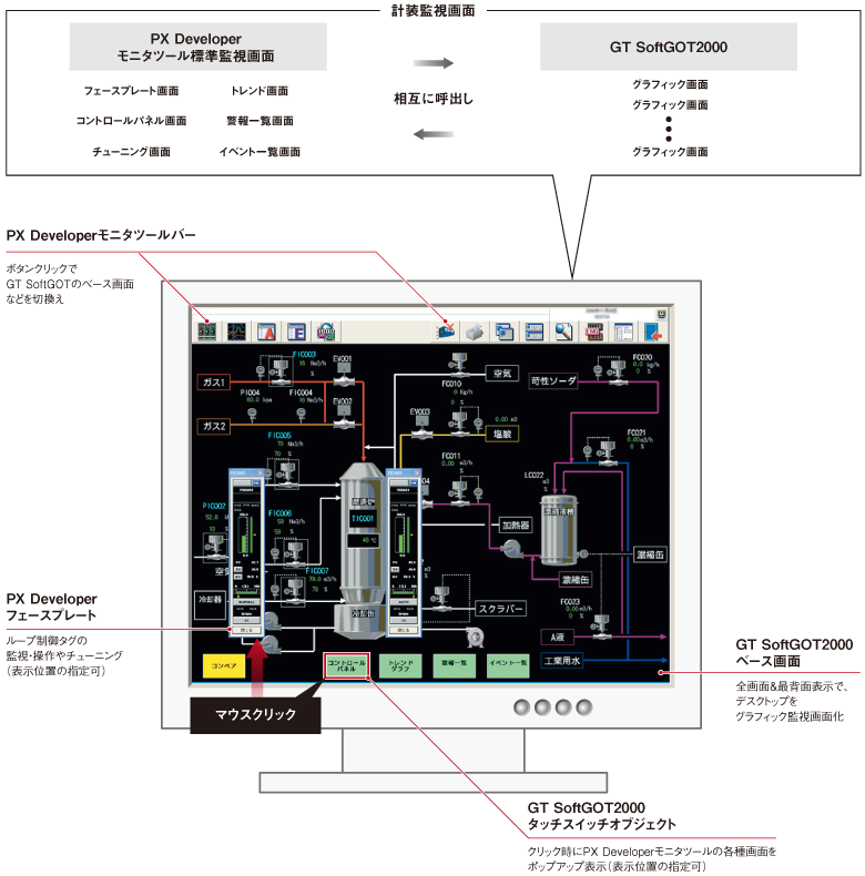 Since the standard monitoring function of the monitor tool and the graphic screen of GT SoftGOT2000 can be called mutually * 1 , the man-hours for creating instrumentation screens can be significantly reduced.
