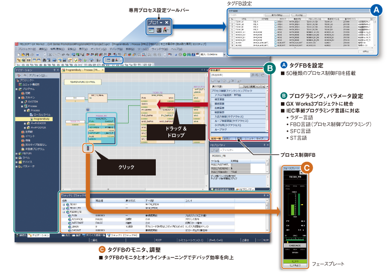 The engineering software GX Works3 enables integrated engineering of FBD language (process control programming) and other languages (LD, ST, SFC). Sophisticated programming environment improves programming efficiency.