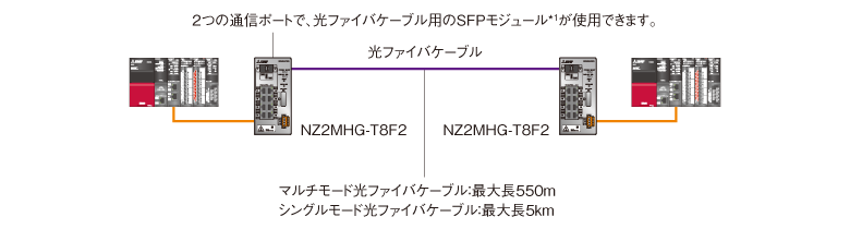 The use of SFP modules * 1 enables the use of optical fiber cables that allow long-distance wiring, so it can be used in systems that require long-distance communication, such as between factories.