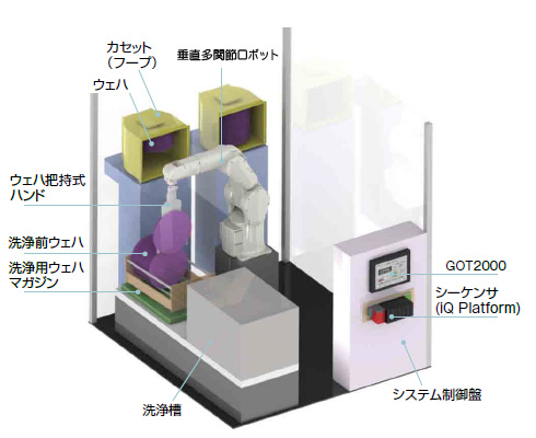 High-speed loading / unloading of wafer cassette (hoop) by vertical articulated robot (long arm / clean compatible).
