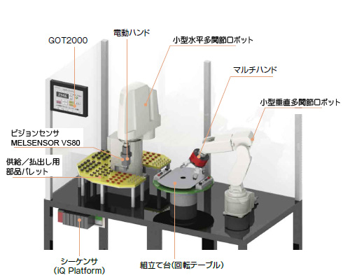 High-speed parts kitting by a horizontal articulated robot, skillful assembly work by a vertical articulated robot, and high-performance hands (multi-hand, electric hand) compatible with various works.