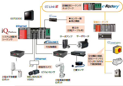 iQ Platform strengthens cooperation between PLC, GOT and robot. Optimal implementation of system operation and visualization. Achieves efficient production management with various networks and MES interfaces.