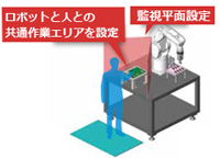 - When the safety fence is opened, the robot continues to operate at low speed inside the surveillance plane. Workers can perform inspection work inside the safety fence and outside the monitoring plane