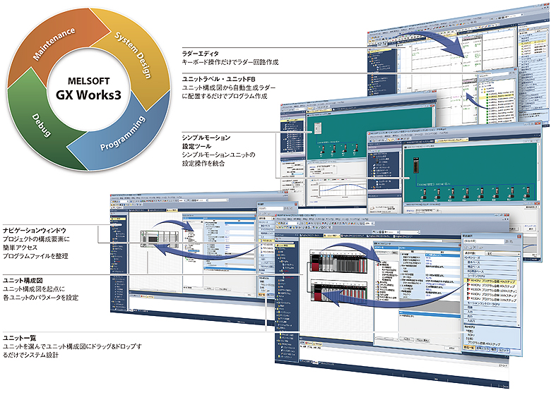 The engineering software GX Works2 has been developed with consideration to make it easy for anyone to program, debug and maintain with intuitive operation. In a comfortable operation environment, design efficiency is further improved.