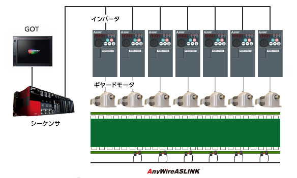 1. Preventive maintenance is possible by vibration analysis using AnyWireASLINK sensor and sequencer + geared motor + vibration sensor. Maintenance cost reduction.