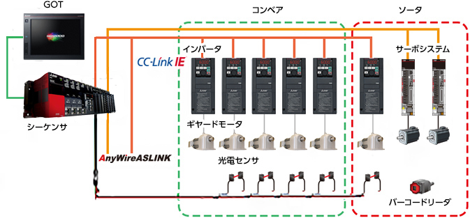 1. High-speed transfer and high-speed sorting are realized by connecting the latest sequencers, inverters, and servos with CC-Link IE capable of high-speed, large-capacity communication.