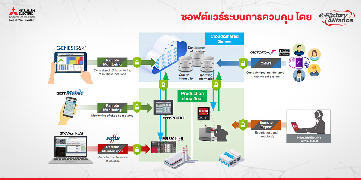 Mitsubishi Electric พัฒนาโซลูชัน IoT ร่วมกับ Partners ในโปรเจกต์ e-F@ctory Alliance ซึ่งมีความท้าทายในการพัฒนาการควบคุมเครื่องจักรและอุปกรณ์ที่มีความซับซ้อน ตั้งแต่ระบบการทำงานไปจนถึงเครือข่ายการเชื่อมต่อ ที่จะสามารถควบคุมการทำงานได้อย่างสมบูรณ์ เสมือนการควบคุมจากหน้าไลน์การผลิต จนได้ออกมาเป็นกลุ่มโซลูชัน FA Remote