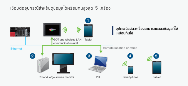 2.GOT 1 เครื่องสามารถเชื่อมต่ออุปกรณ์ผ่าน Web browser ได้พร้อมกันสูงสุด 5 เครื่อง โดยแต่ละเครื่องสามารถทำงานแยกอิสระจากกันได้