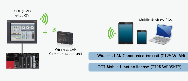 การเชื่อมต่อ GOT กับอุปกรณ์ Mobile devices และ PCs นั้น จะเชื่อมต่อผ่านสัญญาณไร้สาย โดยจะต้องมีการเชื่อมต่อระหว่าง GOT กับ Router ผ่านสัญญาณ Wireless และเมื่อทำการเชื่อมต่อกับ GOT ได้แล้วก็จะทำการตั้งค่า IP Address ของ GOT เพื่อจะเชื่อมต่อไปยัง Web Browser ในส่วนของการดูสถานะการทำงานและการควบคุมการทำงานของหน้าจอนั้นจะต้องทำการเชื่อมต่ออุปกรณ์กับ Router ให้อยู่ในโครงข่ายเดียวกัน จากนั้นจึงพิมพ์ IP Address เพื่อเชื่อมต่อ GOT ต่อไป