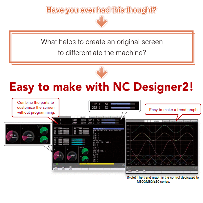 Screen created with NC Designer2 can be registered in the main operation, setup and editing menus. - Easy to create custom screens with template function and macro function