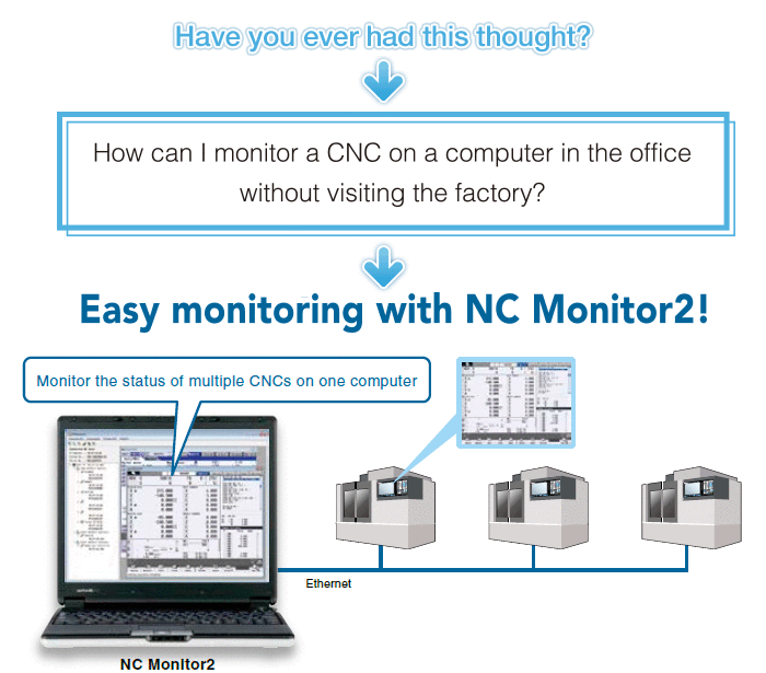 | CNC connections | Supported CNCs : M800/M80/M700V/M70V/E70/C80 SeriOS supportedes Connection configuration : Ethernet Connectable CNCs : 10 (max.) |