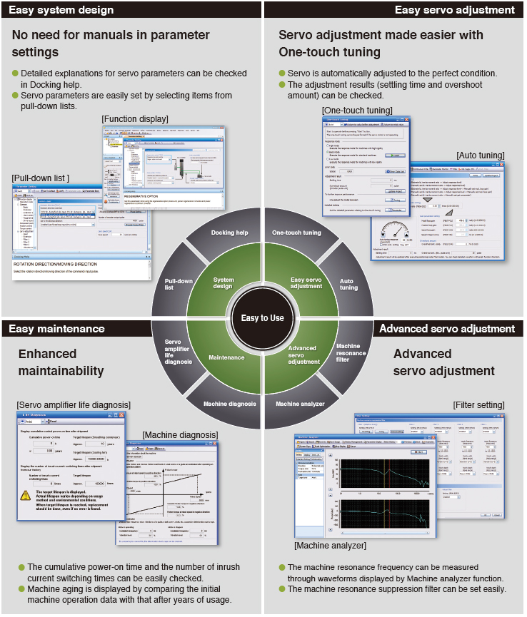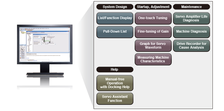 Various tools are available for more efficient maintenance of servo amplifiers and motors.