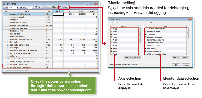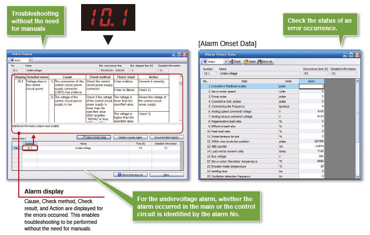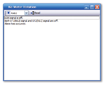 In case that the target axis does not rotate, the cause for that failure can be obtained from servo amplifiers, which ensures smooth and faster startup.