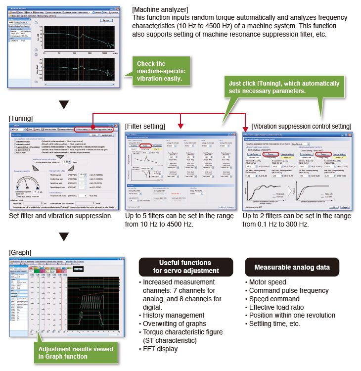 ▪ Machine resonance suppression can be implemented by setting the filter and the vibration suppression control from the "Tuning" screen