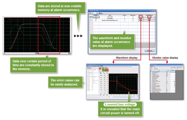 Servo data (motor current and position command, etc.) of before/after the error can be read from the Drive recorder for error cause analysis. Monitor values and waveforms of up to 16 alarms occurred can be checked.
