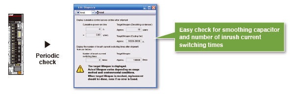 The Servo amplifier life diagnosis function displays cumulative operation time and on/off times of inrush relay, providing an indication of replacement time for servo amplifier parts such as capacitors and relays.