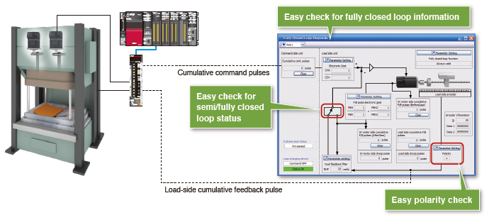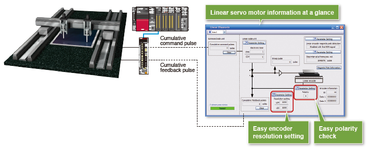 The feedback pulses from an external linear encoder, the polarity and the resolution settings can be checked at a glance, enabling shorter adjustment time.