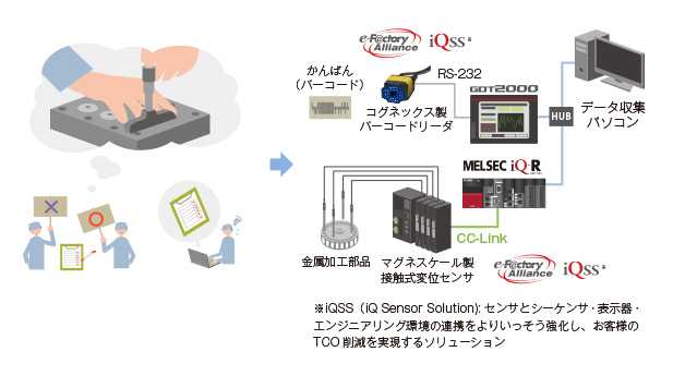 A bar code reader is set on a jig to manage lot numbers, linked with sensor measurement data, reducing inspection time and achieving traceability.