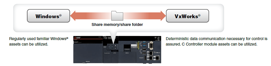 MI5000 สามารถรัน 2 ระบบปฏิบัติการได้ในเวลาเดียวกัน ทั้ง VxWorks® สำหรับควบคุมการทำงานของอุปกรณ์แบบ real-time และเก็บข้อมูล รวมถึงสามารถใช้งานระบบปฏิบัติการ Windows® ที่ใช้สำหรับแสดงผลการวิเคราะห์ข้อมูล ทำให้ MELIPC รองรับทั้งการควบคุมและประมวลผลข้อมูล ช่วยลดค่าใช้จ่ายการวางระบบและลดการใช้พื้นที่ของอุปกรณ์ ทำให้การแลกเปลี่ยนข้อมูลระหว่าง OS ส่งผ่านข้อมูลระหว่างกันได้โดยง่ายด้วย memory และ folder สร้างความอิสระในการทำงานของอุตสาหกรรมได้อย่างตอบโจทย์