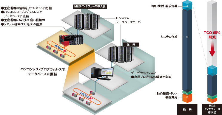 By using the MES interface, the PLC and database can be directly connected, and the system configuration can be simplified. Also, since no gateway PC or program is required for connection, the work man-hours and construction period for system construction will be reduced compared to conventional systems. Furthermore, by using the highly reliable MES interface, the maintenance and repair cost of the personal computer can be reduced.