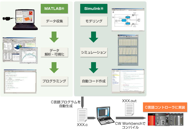 It is possible to automatically generate the source code for the C language controller from the calculation results (model operation) designed and verified with MATLAB (numerical calculation language as integrated development environment) and Simulink (model-based design tool, simulator).