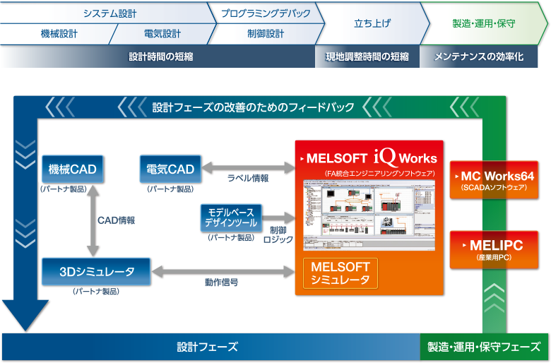 The engineering chain consists of a “design phase” and a “manufacturing / operation / maintenance phase”. In eF @ ctory's smart factory engineering, by linking "our engineering tools" and "partner products", we will start from system design and make maintenance more efficient.