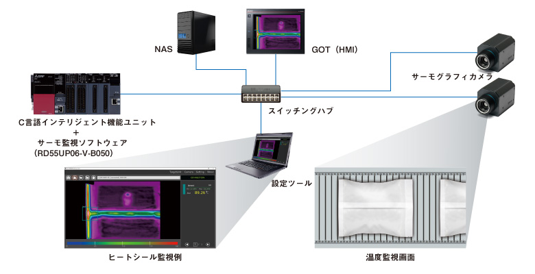 The MELSEC iQ-R series can be directly connected to a thermography camera without a personal computer, using a C language intelligent function module preinstalled with Mitsubishi Electric Mechatronics Software, Inc. thermo monitoring software. It is possible to inspect the heat seal condition in the food manufacturing process, etc., by taking a picture with a thermographic camera. When the contents get caught in the heat seal part, the temperature information and the temperature image of that part can be confirmed by GOT (HMI), and quick pass / fail judgment is realized.