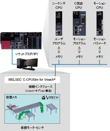 Using 3D-CAD data, you can build a virtual mechanism (digital mockup) and simulate the mechanical operation. Debugging software from the stage before the device is completed enables front-loading of mechanical operation verification and shortens the development schedule. In addition, it is possible to virtually verify abnormal operations that are difficult with actual equipment, and improve software quality.