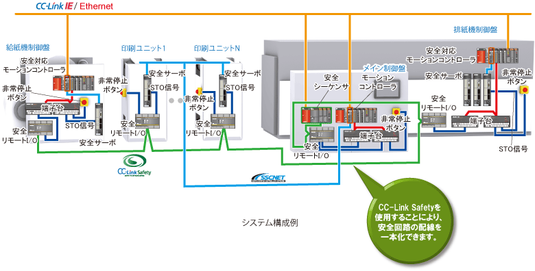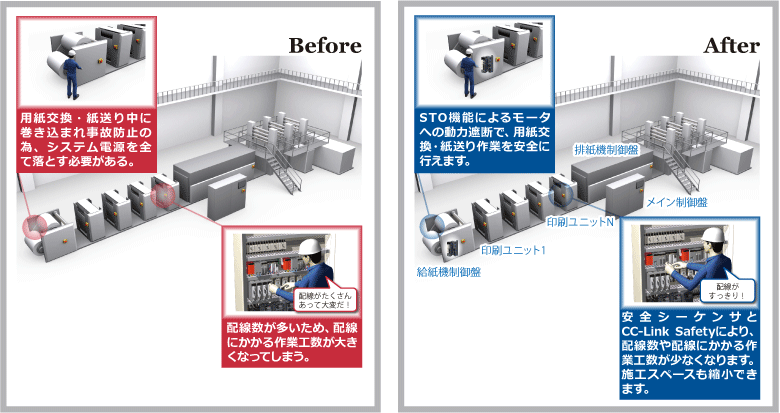 For printing machine safety control, we propose a system that combines a safety sequencer and a safety-compatible motion controller that can cooperate with distributed I / O control and drive unit safety.