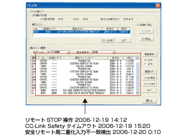 You can check the operating status of the safety CPU, current errors, and operation / error histories (including error histories of the CC-Link Safety system). Up to 3000 operation / error histories can be recorded and saved to a CSV file.