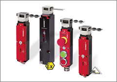 Ideal as a protective measure for doors on safety fences. Functions such as an emergency stop button, illuminated push button, and lamp can be installed in the evaluation unit.
