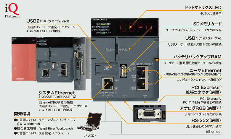 Real-time OS VxWorks ® standard (Q24DHCCPU-V / 24DHCCPU-VG) Partner OS (Q24DHCCPU-LS / 26DHCCPU-LS) iQ Platform compatible dot matrix LED display Ethernet (3ch.), USB x 2, USB x 2, PCI Express ® , RS-232, analog RGB * 2