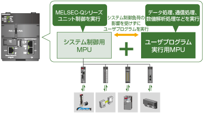 Equipped with 2 MPUs for system control such as MELSEC-Q series module control and MPU for executing user programs.