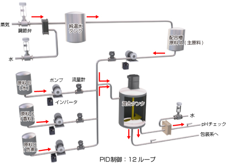 Based on the raw material A, the set value of raw material A (main raw material) and the ratio of other raw materials are set from the host computer and GOT according to the production plan, and the flow ratio of raw materials B to D is controlled based on raw material A. The flow rate of raw materials is controlled by an inverter, and the temperature of the pure hot water tank is controlled.