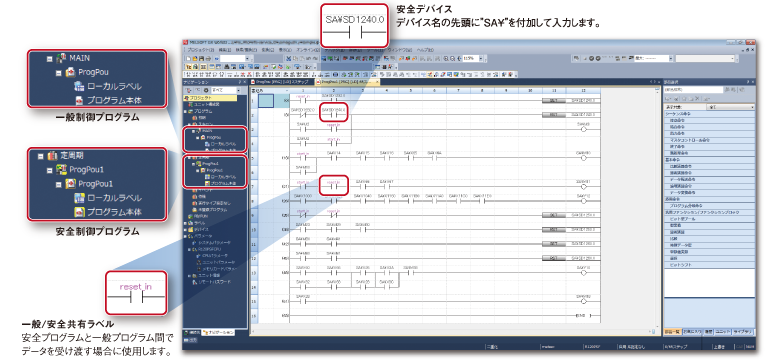 A general control program and a safety control program can be created in the GX Works3 SIL 2 project, and the safety control program uses a ladder to create logic. The execution type of the program can be specified only at fixed intervals, and the program is created using safety devices and general / safety shared labels.